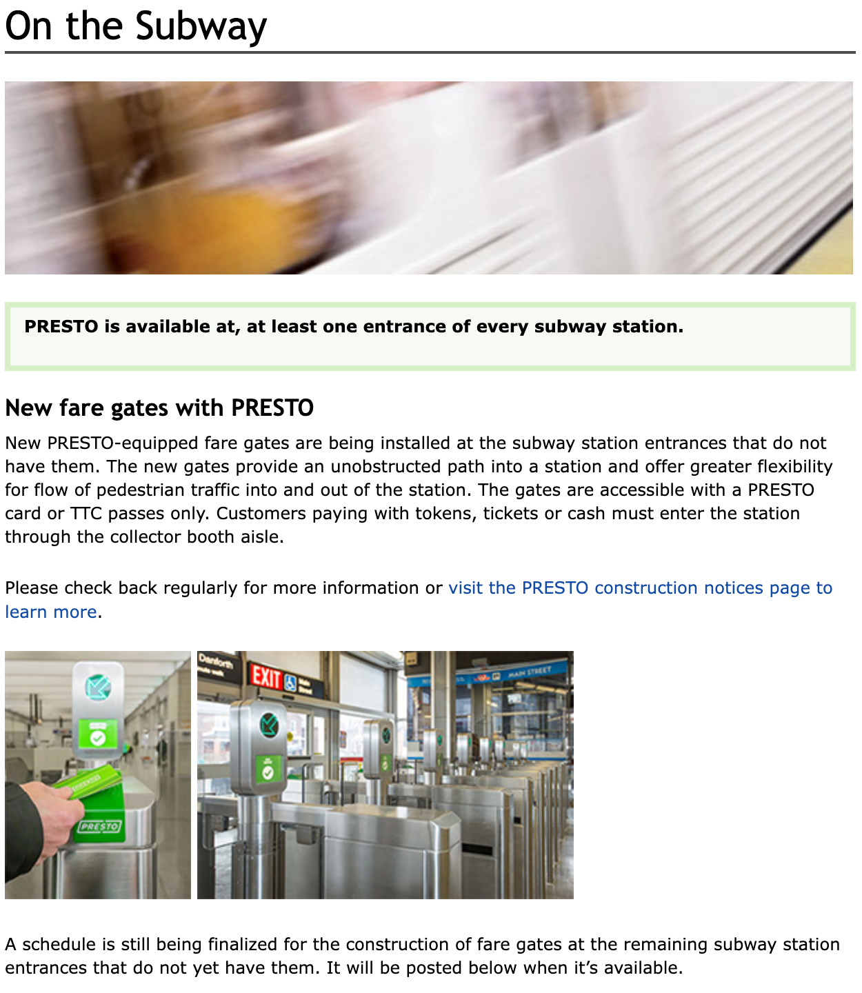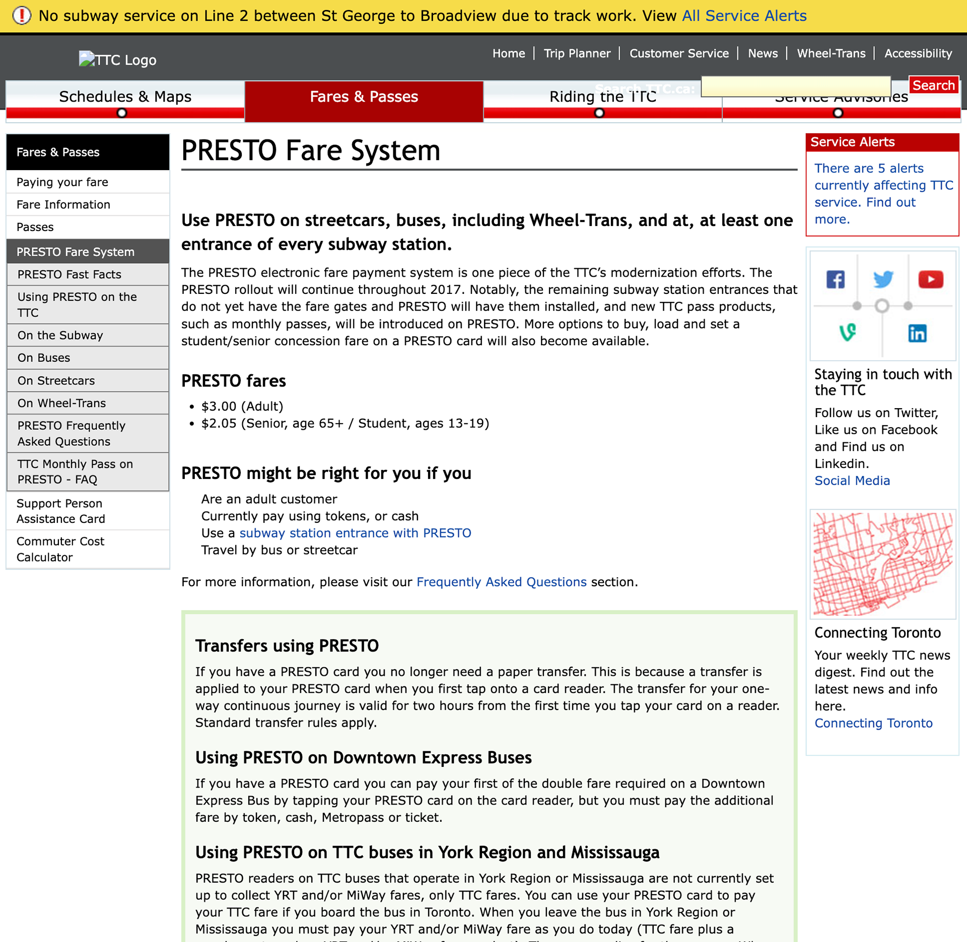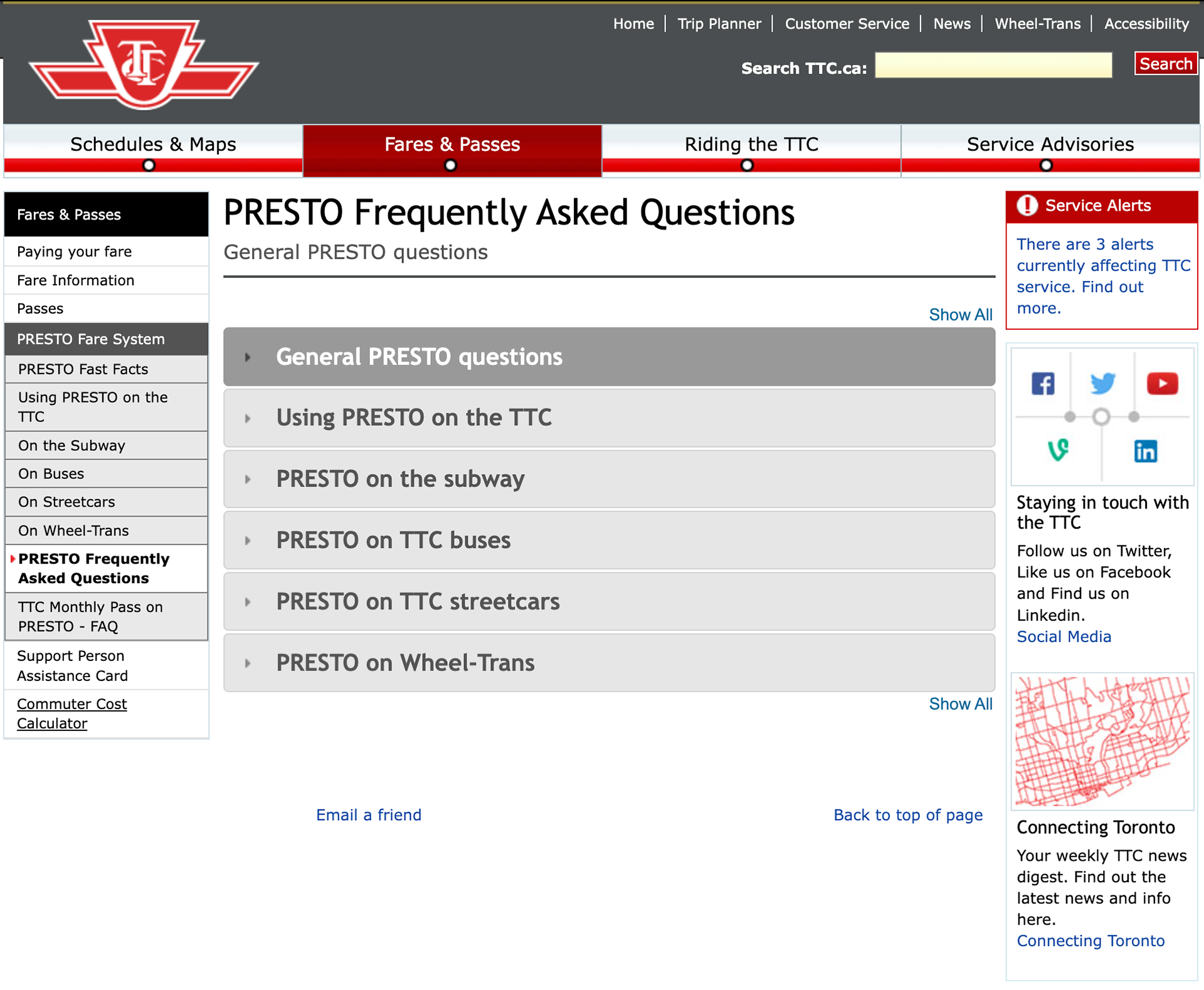 We developed a phased communications plan for web and socials. We added PRESTO branding and communications on TTC.ca, and created a related subsection with information and an FAQ. I consistently updated this subsection with the latest information for customers provided by our teams.