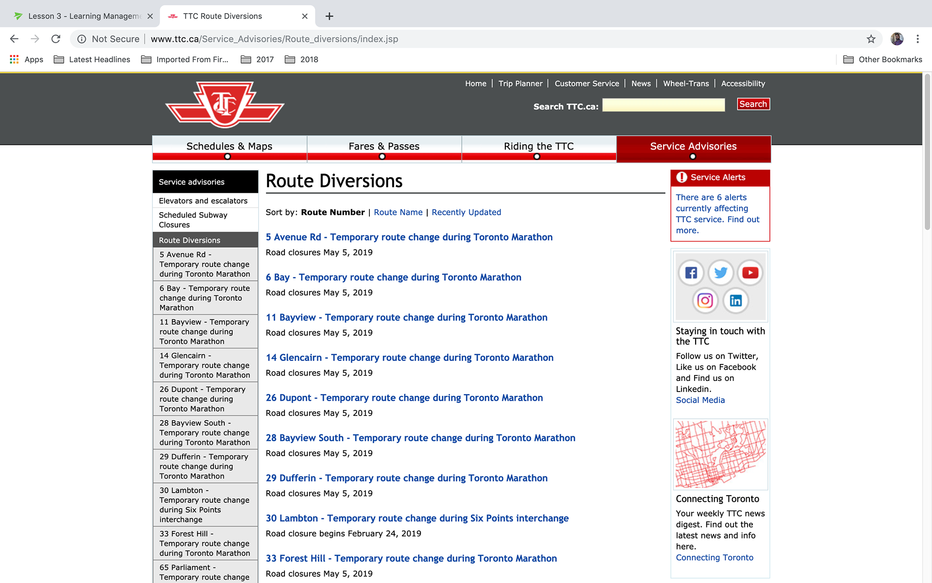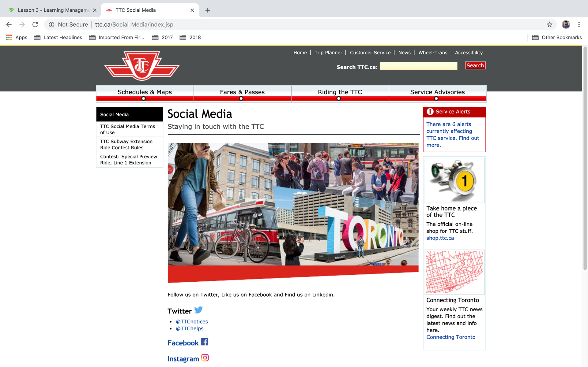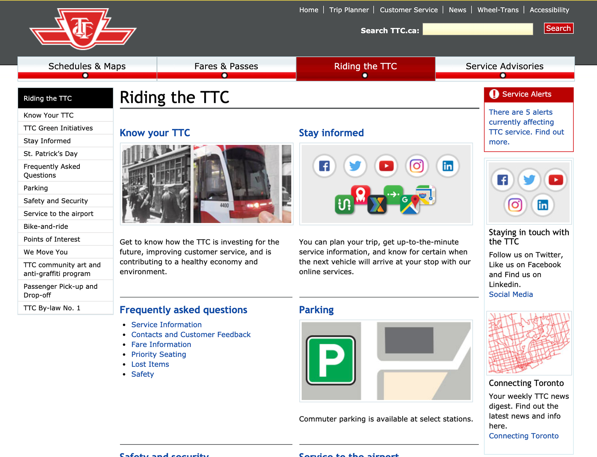 At the TTC, I was part of a small two-person team responsible for maintaining and updating TTC.ca, the organization’s major public-facing website. The site received over 100,000 daily visitors and contained thousands of active pages requiring ongoing daily, weekly, monthly, and annual updates.